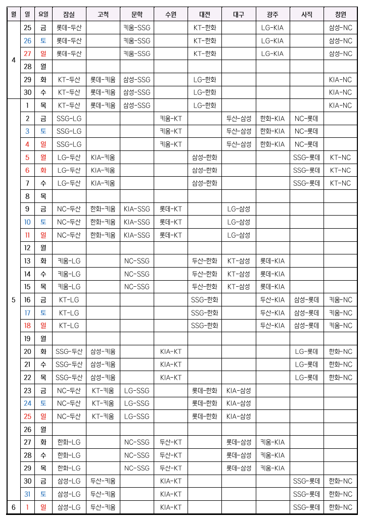 ✔️ 특히 이번 4월 말부터 5월 초에는5월 5일 어린이날이 월요일임에도 불구하고, KBO는 이 기간을 활용해 4월 29일부터 5월 7일까지 9연전을 편성하기로 했습니다.