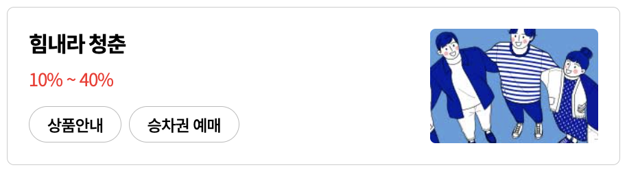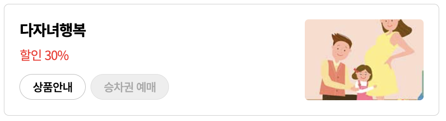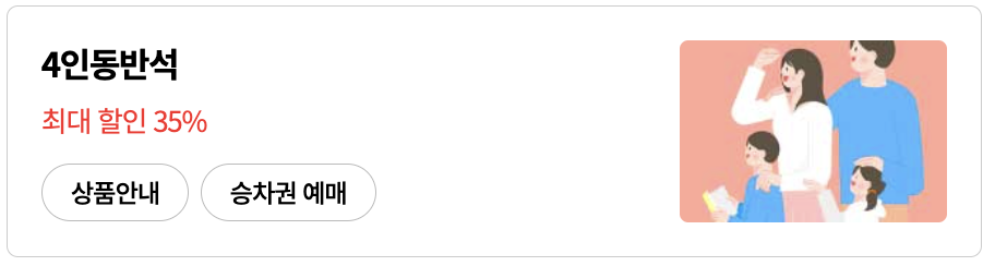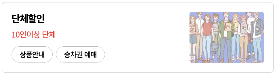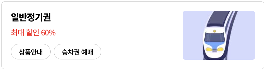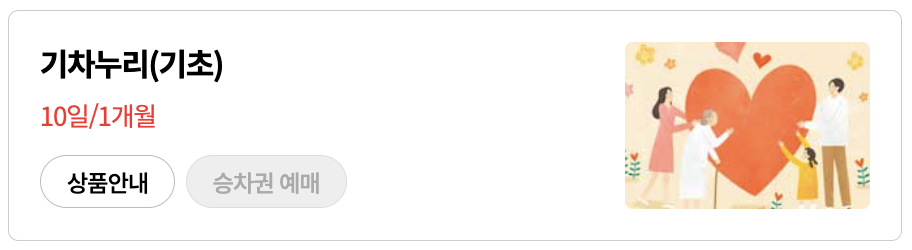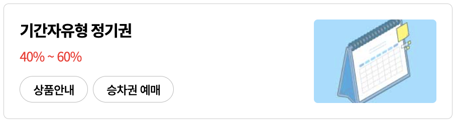 ![]() - 10일 이상 1개월 이내 시작일과 종료일을 선택 - 토, 일, 공휴일, 명절 기간 사용 가능(사용 시 운임에 포함) ■ 할인 내용: 구간·기간·승객 유형에 따라 45%~60% 할인 |