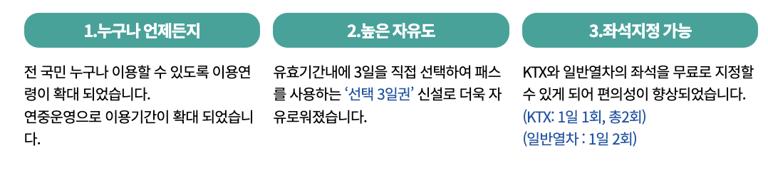 1. 전 국민을 대상으로 판매되는 패스로, 2. 유효기간 3일 또는 7일이내 일정 기간 동안 IKTX의 좌석, 일반열차(ITX-마음, ITX-청춘, ITX-새마을, 새마을, 무궁화, 누리로)의 좌석 및 입석 ㆍ자유석이용할 수 있습니다. 3. 무료로 좌석 지정까지 가능해졌습니다.